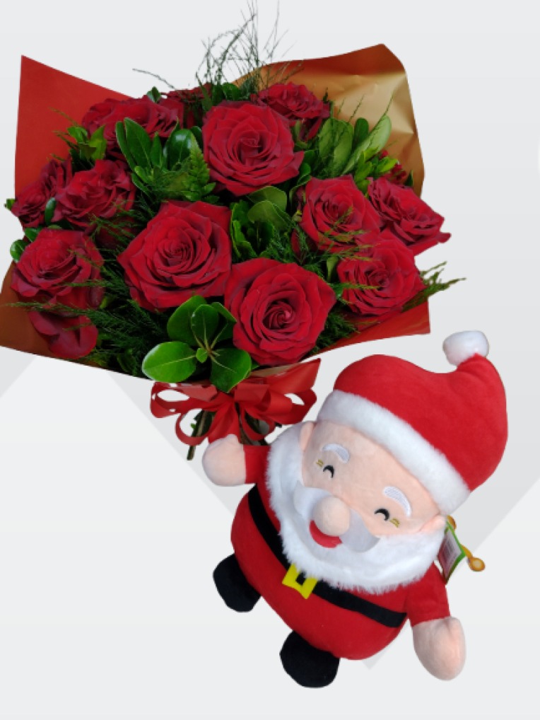 um lindo buque com 12 rosas colombianas vermalhas com embalagem especial. E uma pelucia de papai noel trazendo a alegria do natal a quem é presenteado.