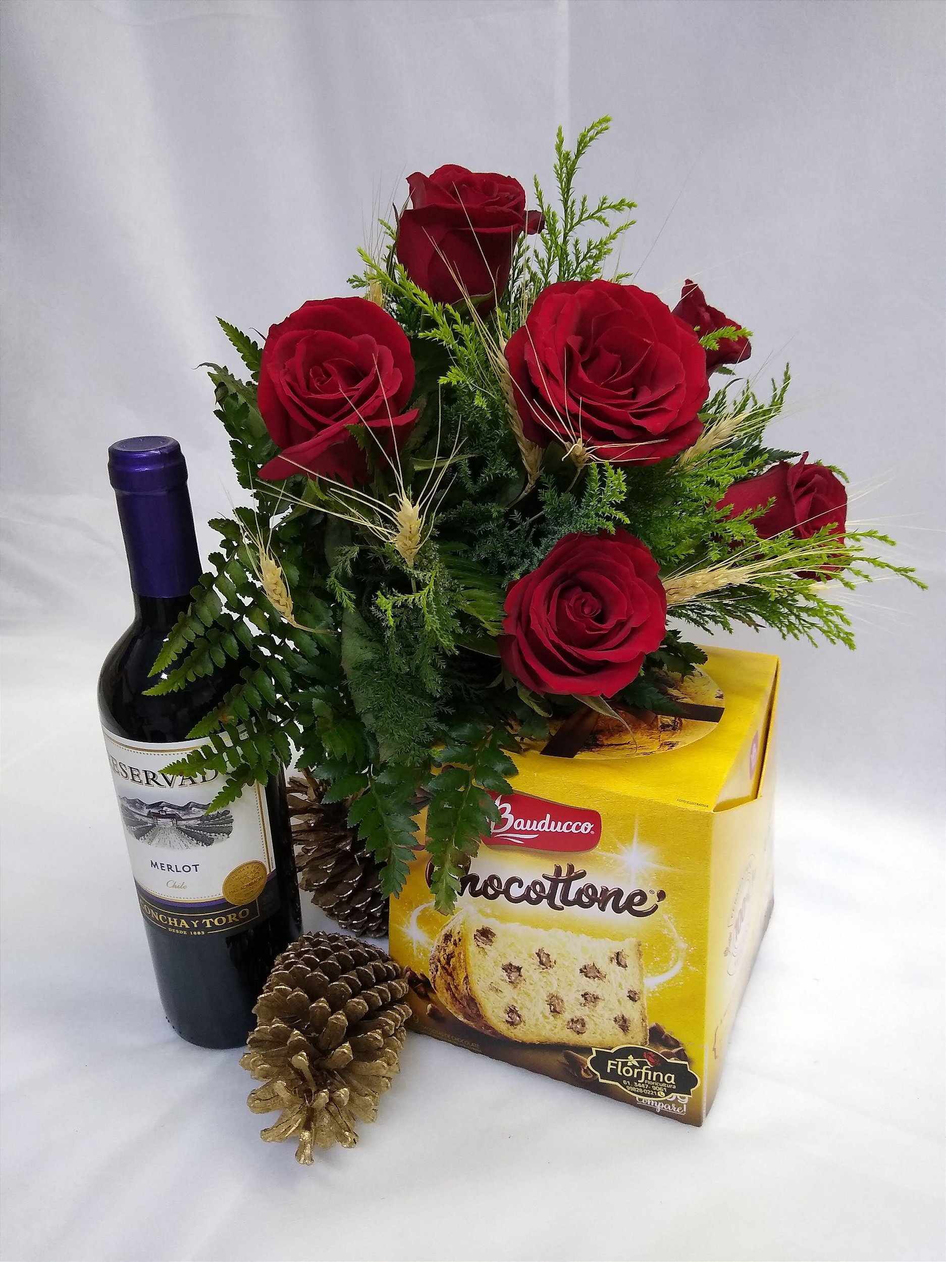 Um combo natalino com 1 lindo buquê com 6 rosas , 1 vinho terra nostra ou concha y toro  e 1 panetonne  bauducco com 500gr.